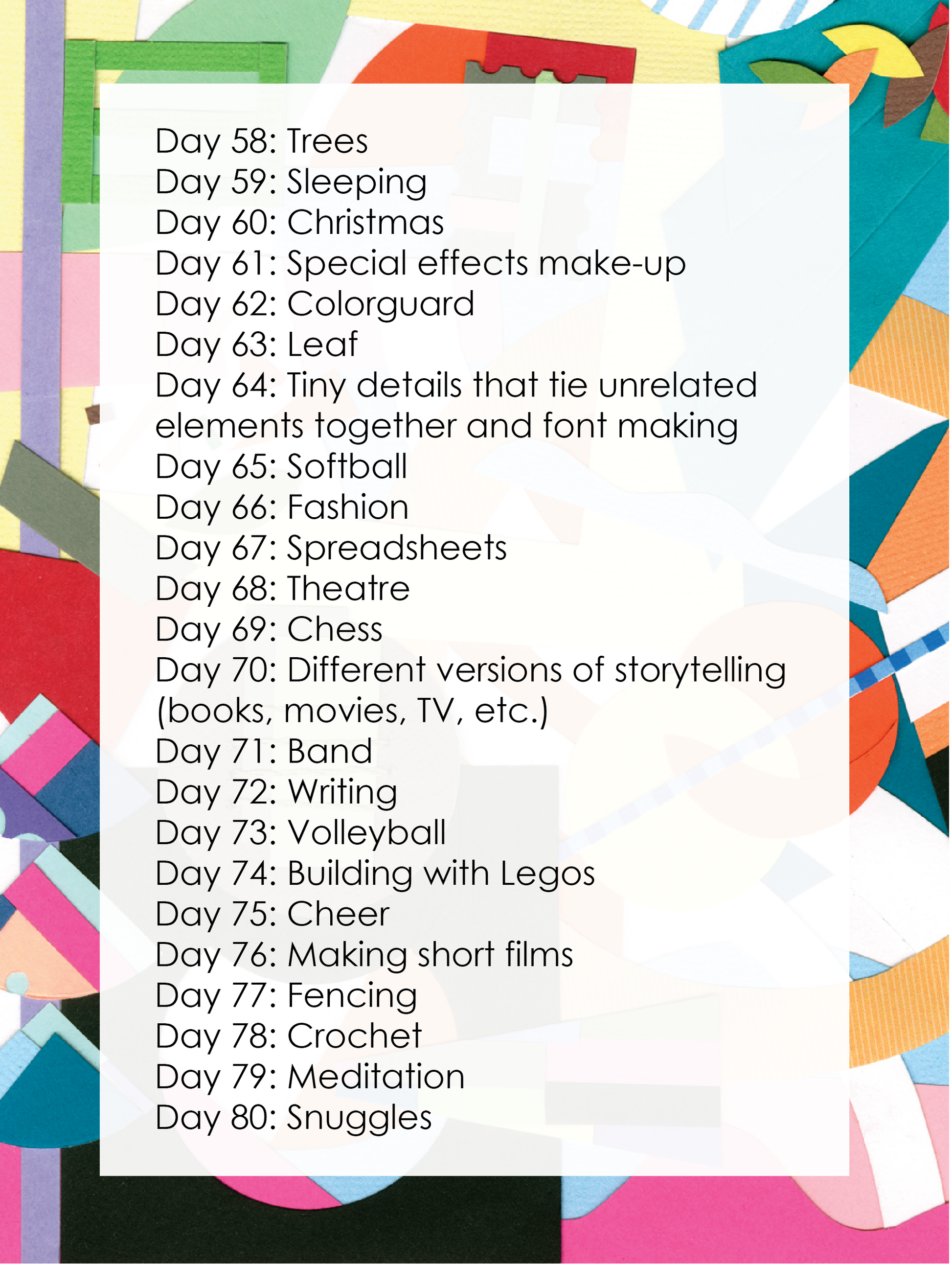 This is the collage version of my 100 Day Project! Every day for 100 days, I added 1 piece to this page.