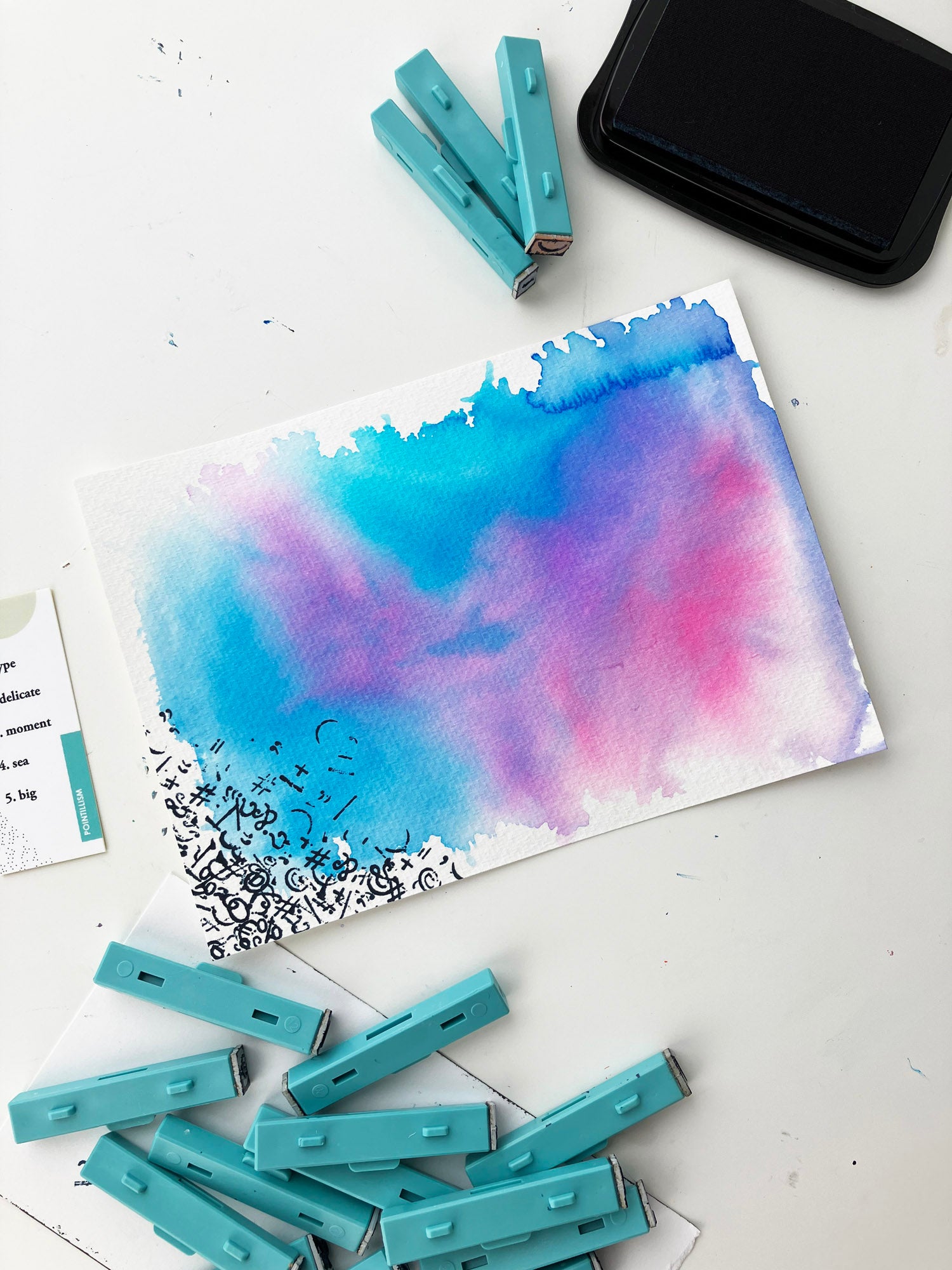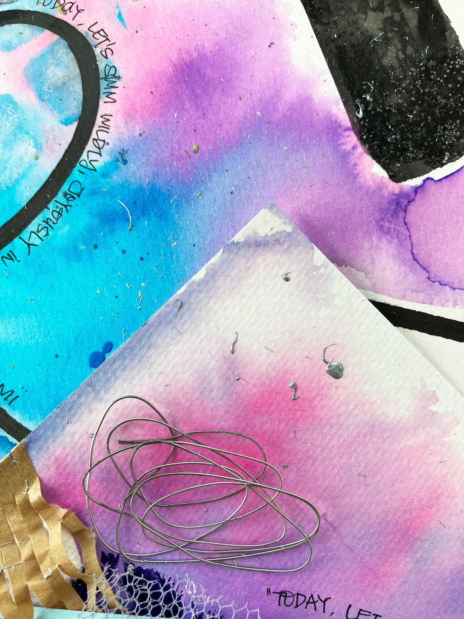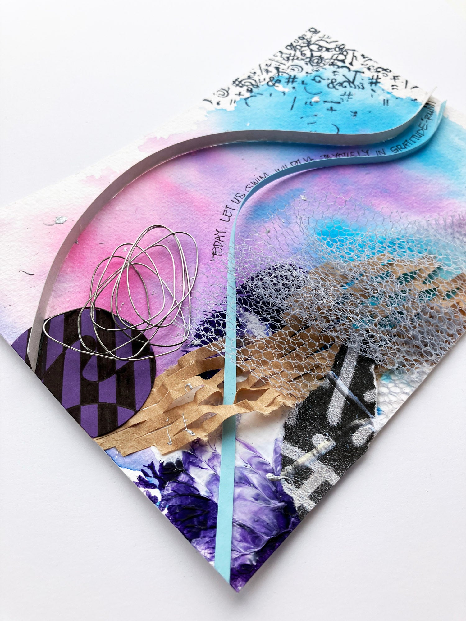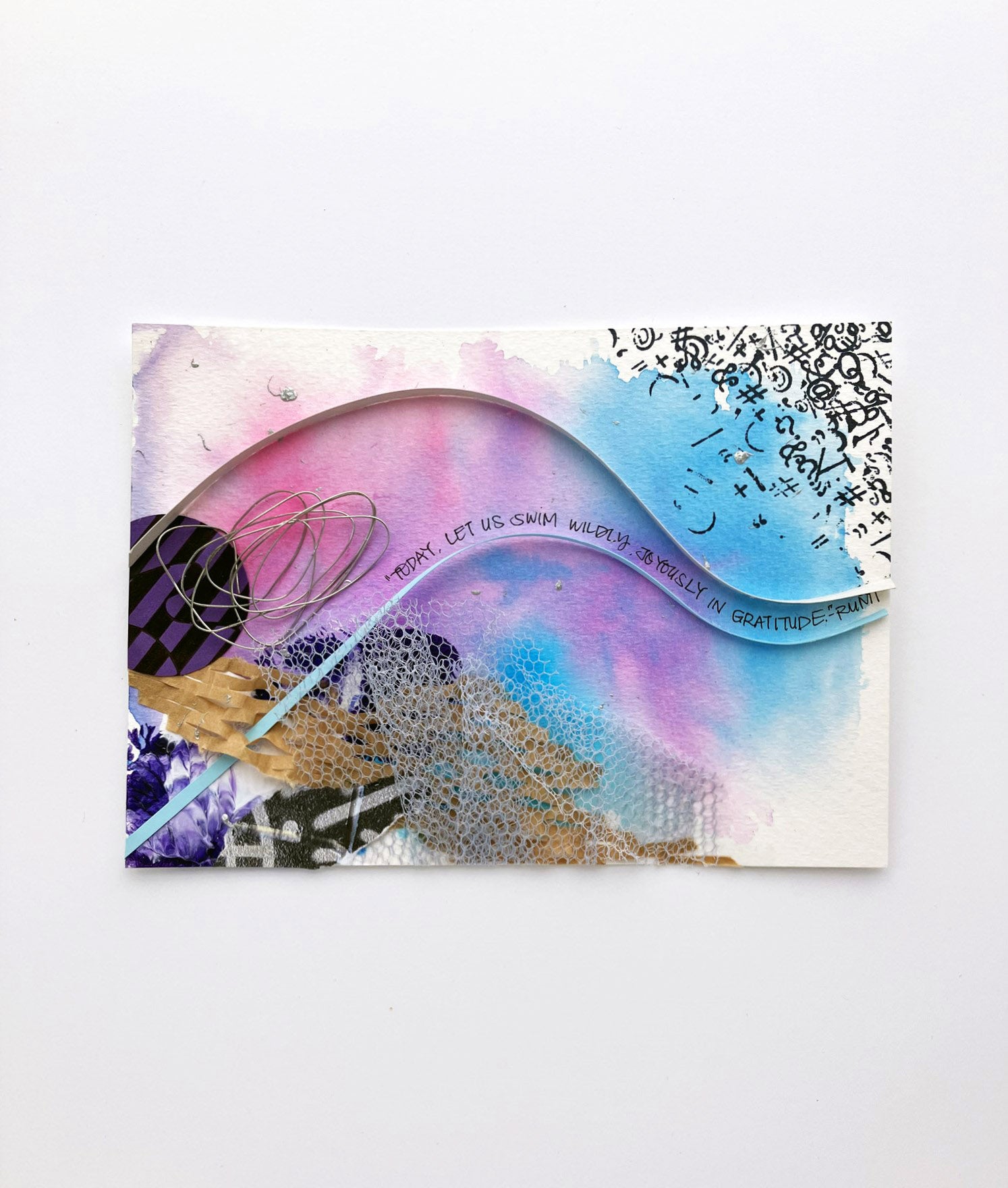 This mini began with one of my favorite techniques and a bright splash of color! It evolved into adding a variety of elements to create a scene of waves crashing onto the beach and includes one of my favorite Rumi quotes.