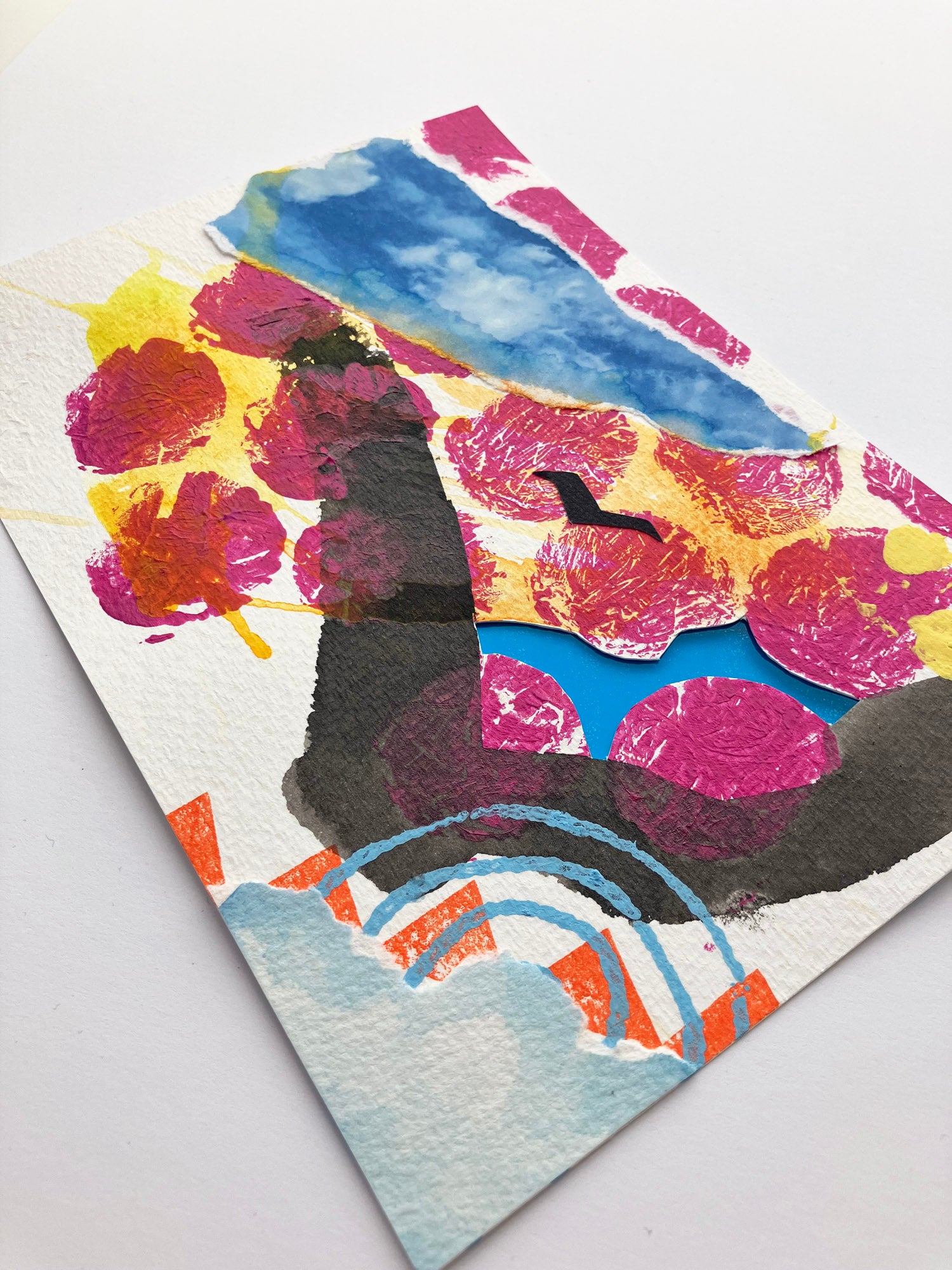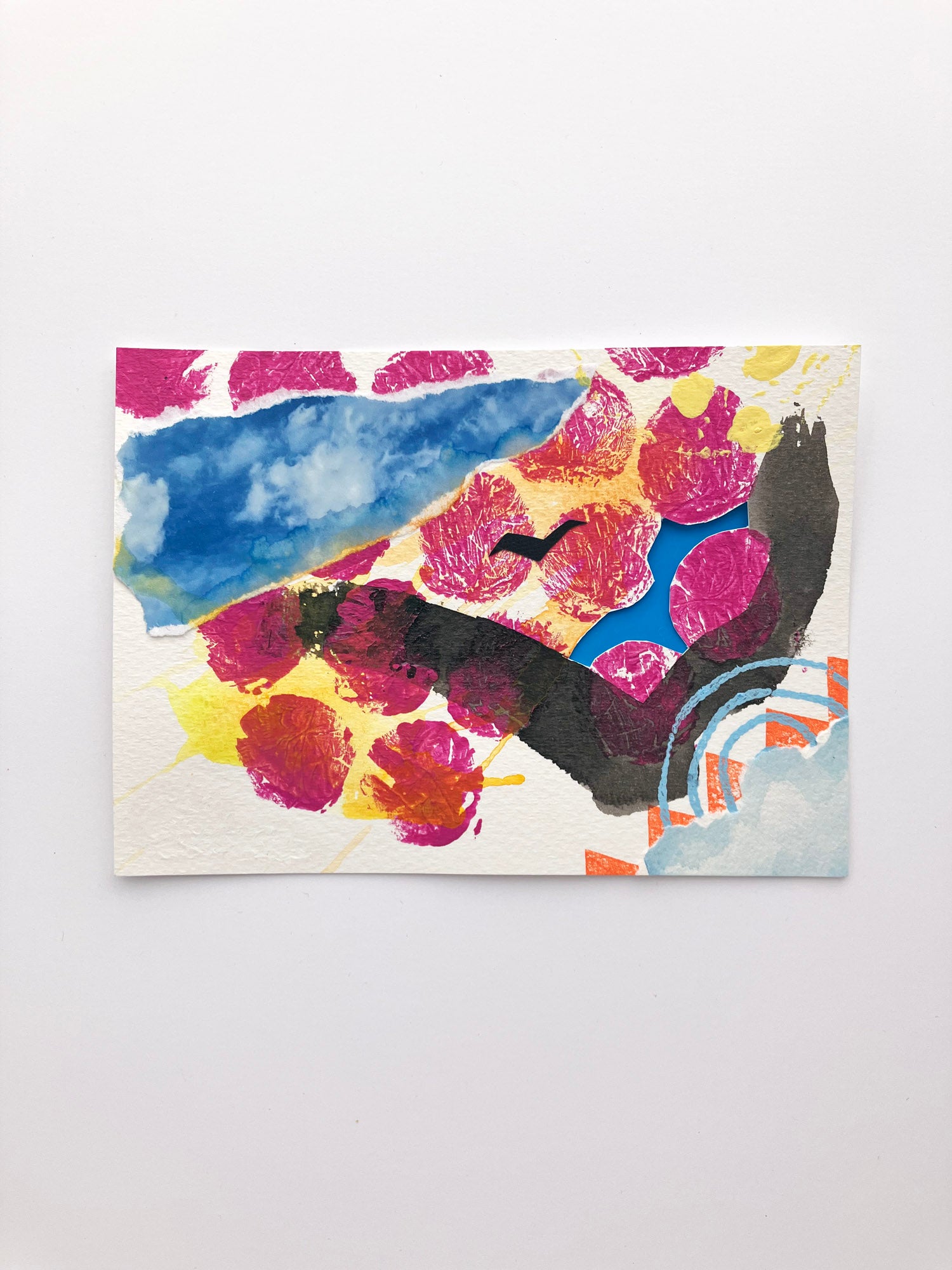 This mini began with bright pink circles and a bold black mark. It wasn't until I turned the paper around the next day that I saw a flying bird. That became my inspiration for the rest of this piece--I wanted to create a scene of flight and freedom, of soaring through the clouds in the sky.