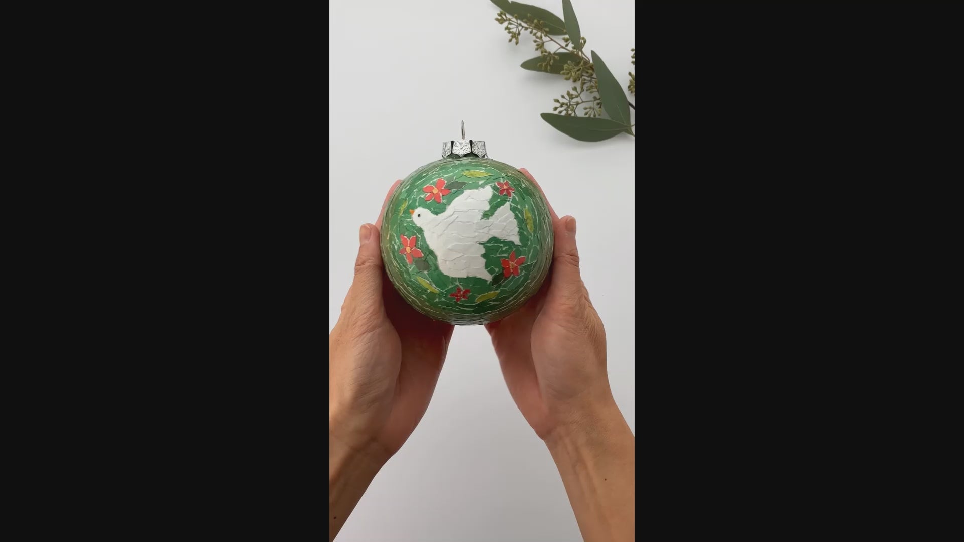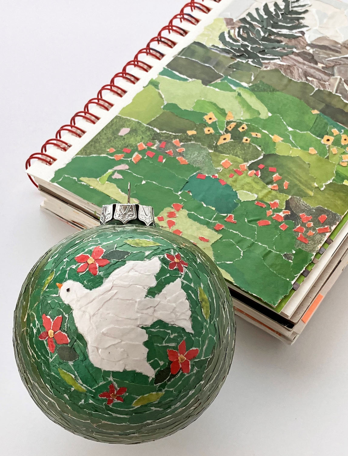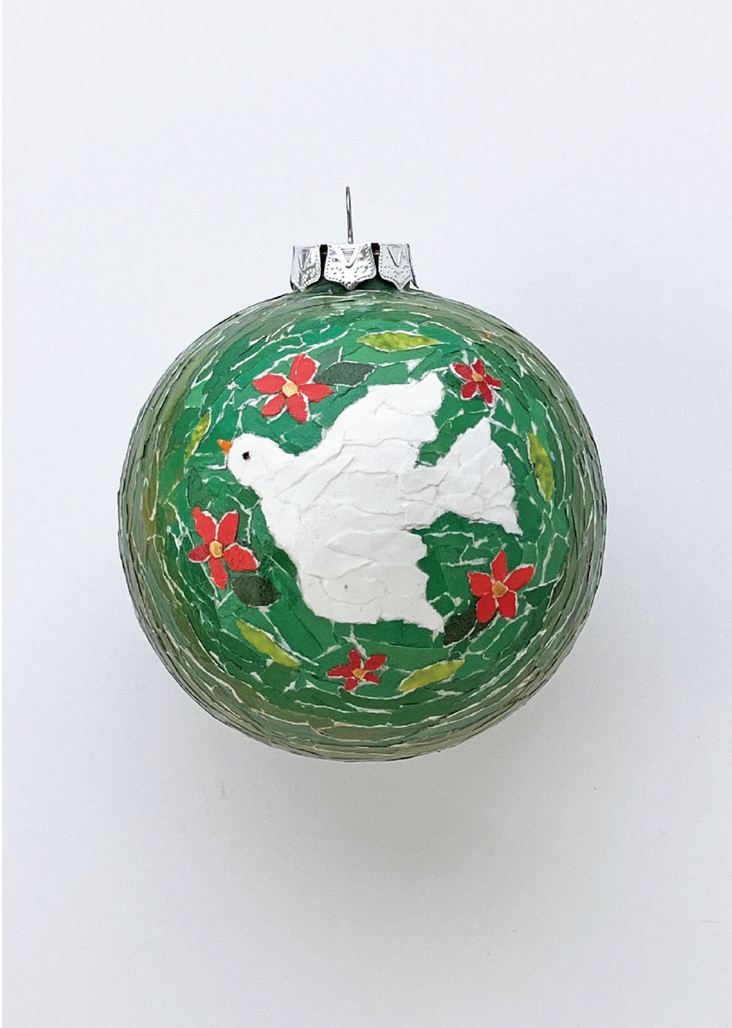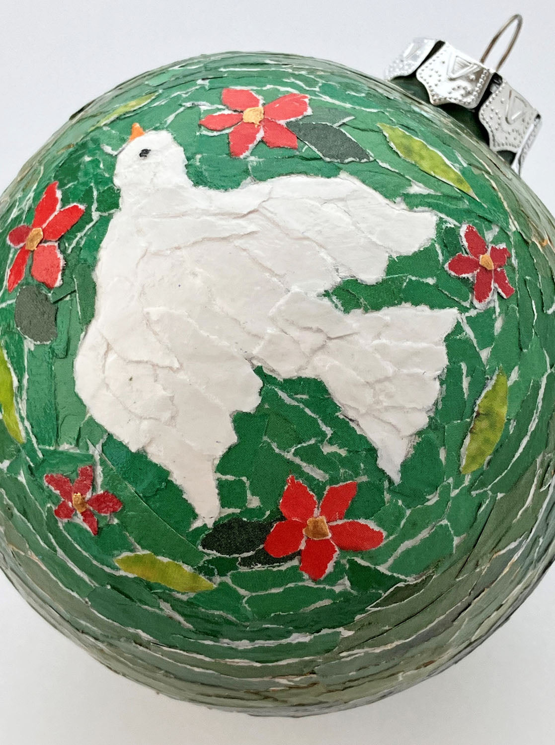 Each piece of paper was torn by hand from catalogs and magazines and individually glued onto the ornament. I chose a dove as the centerpiece as these lovely creatures represent peace, freedom, and love--all things we could use more of here at home and around the world.