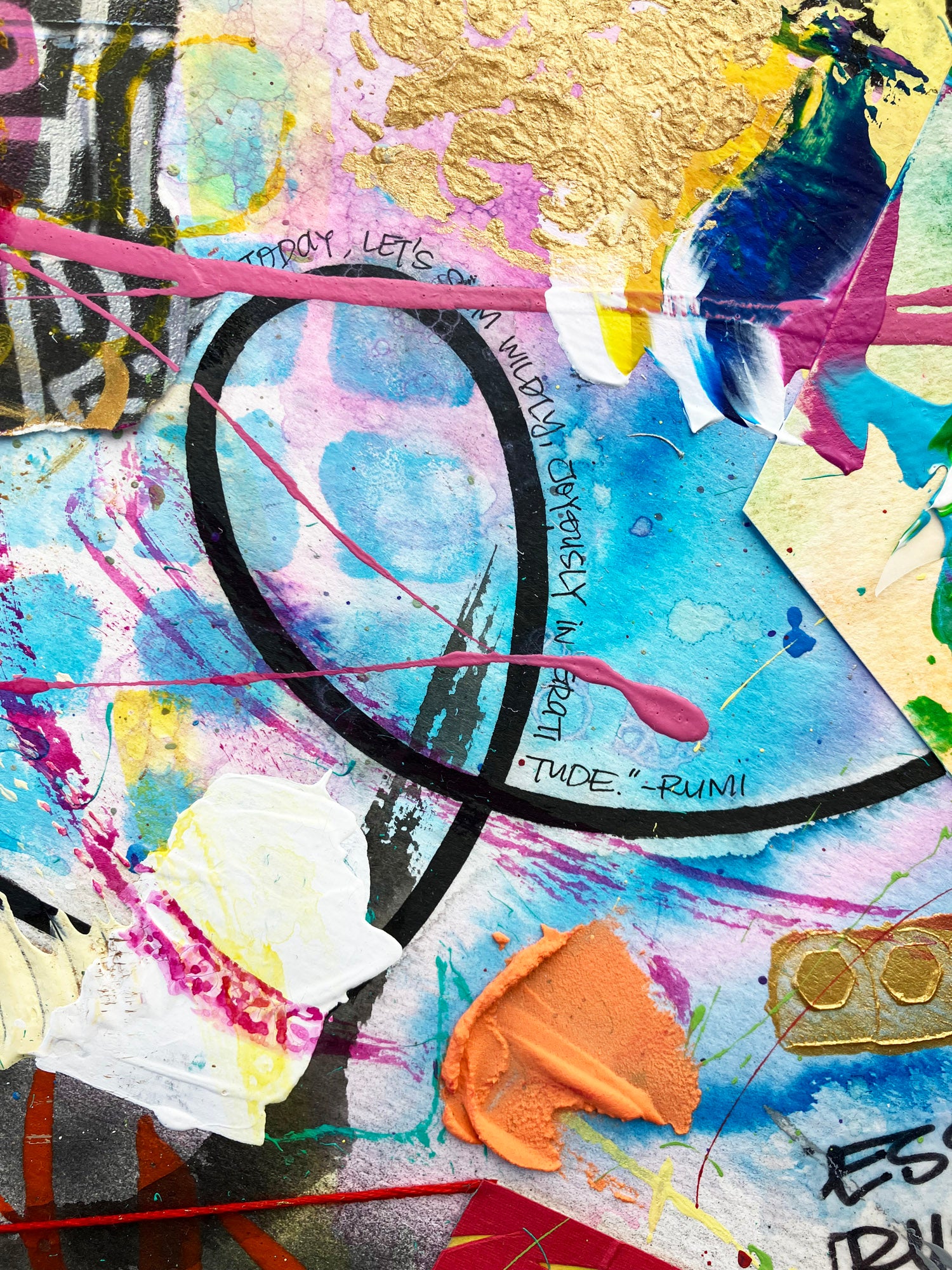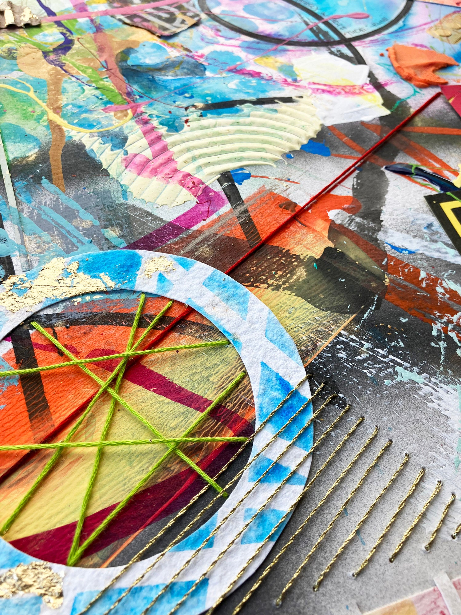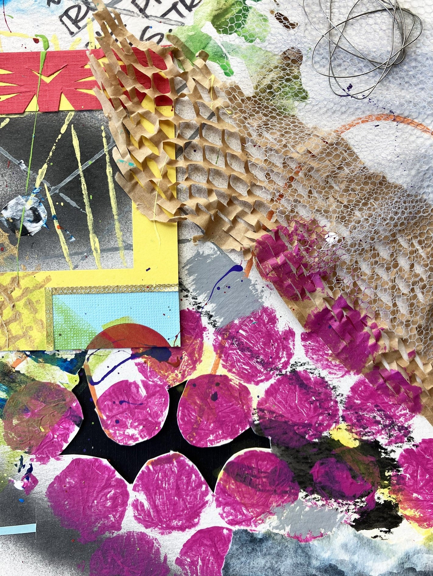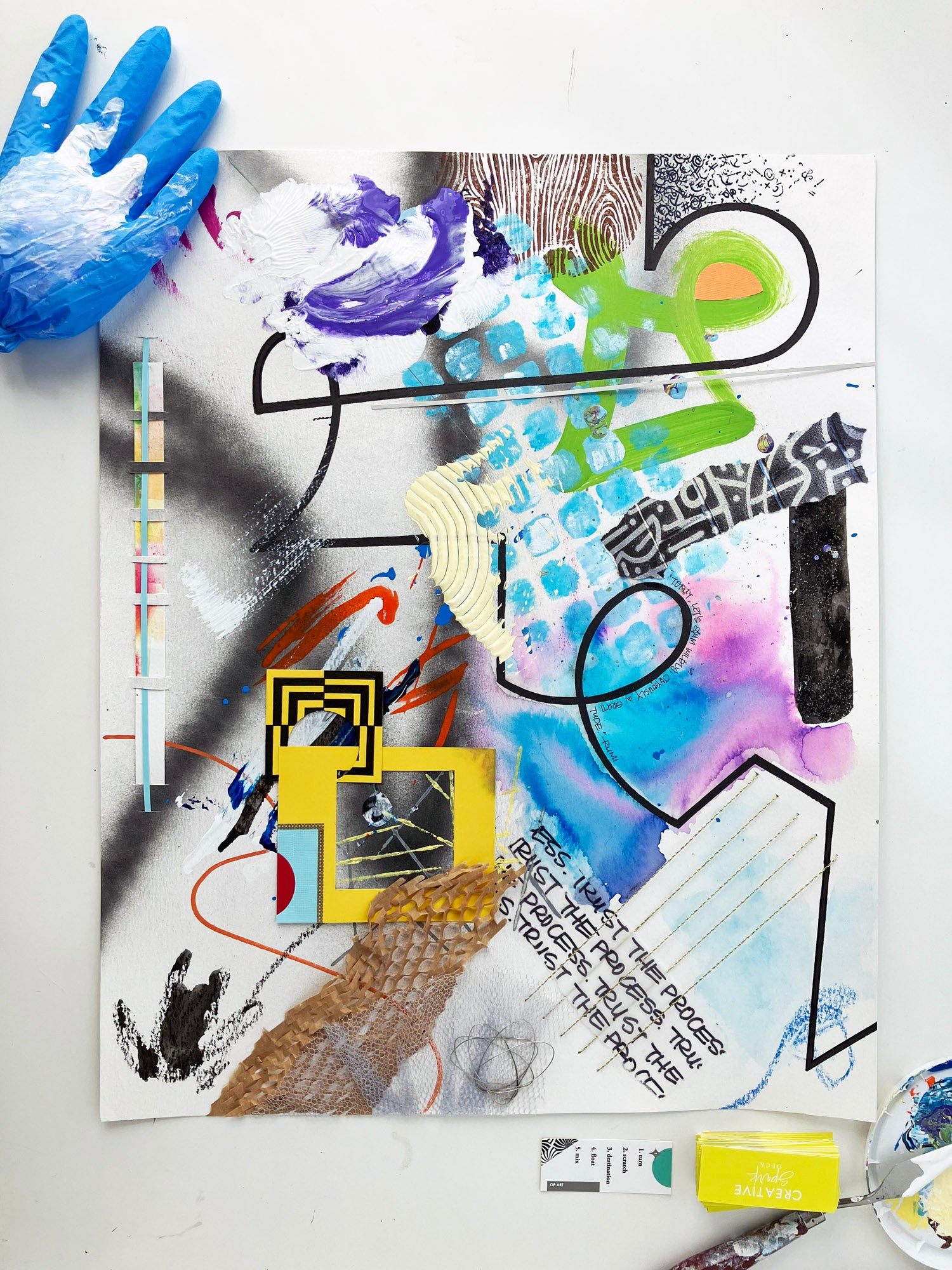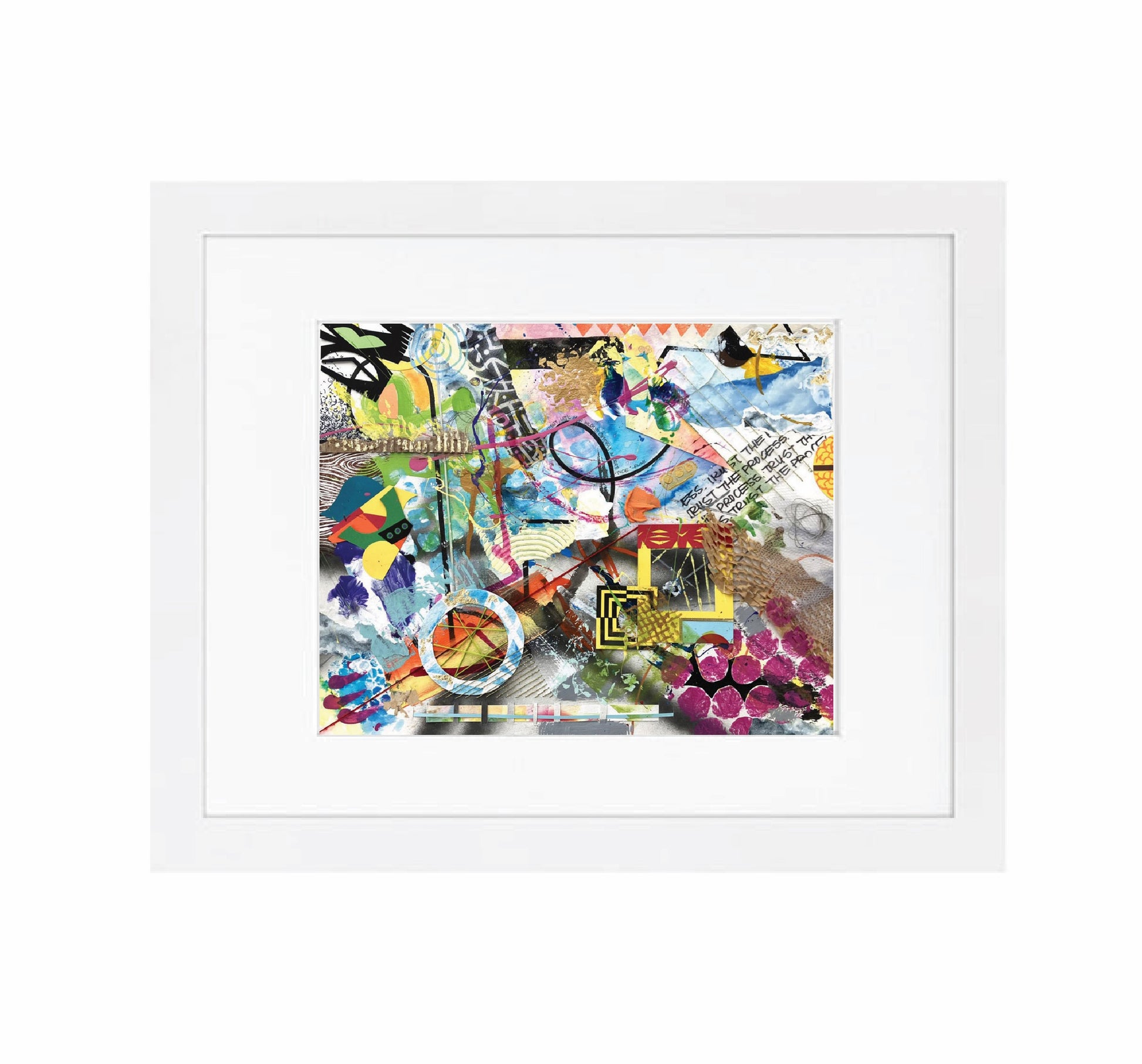 - Original mixed media piece is created with a variety of tools and mediums including paint, inks, watercolors, papers, and more.