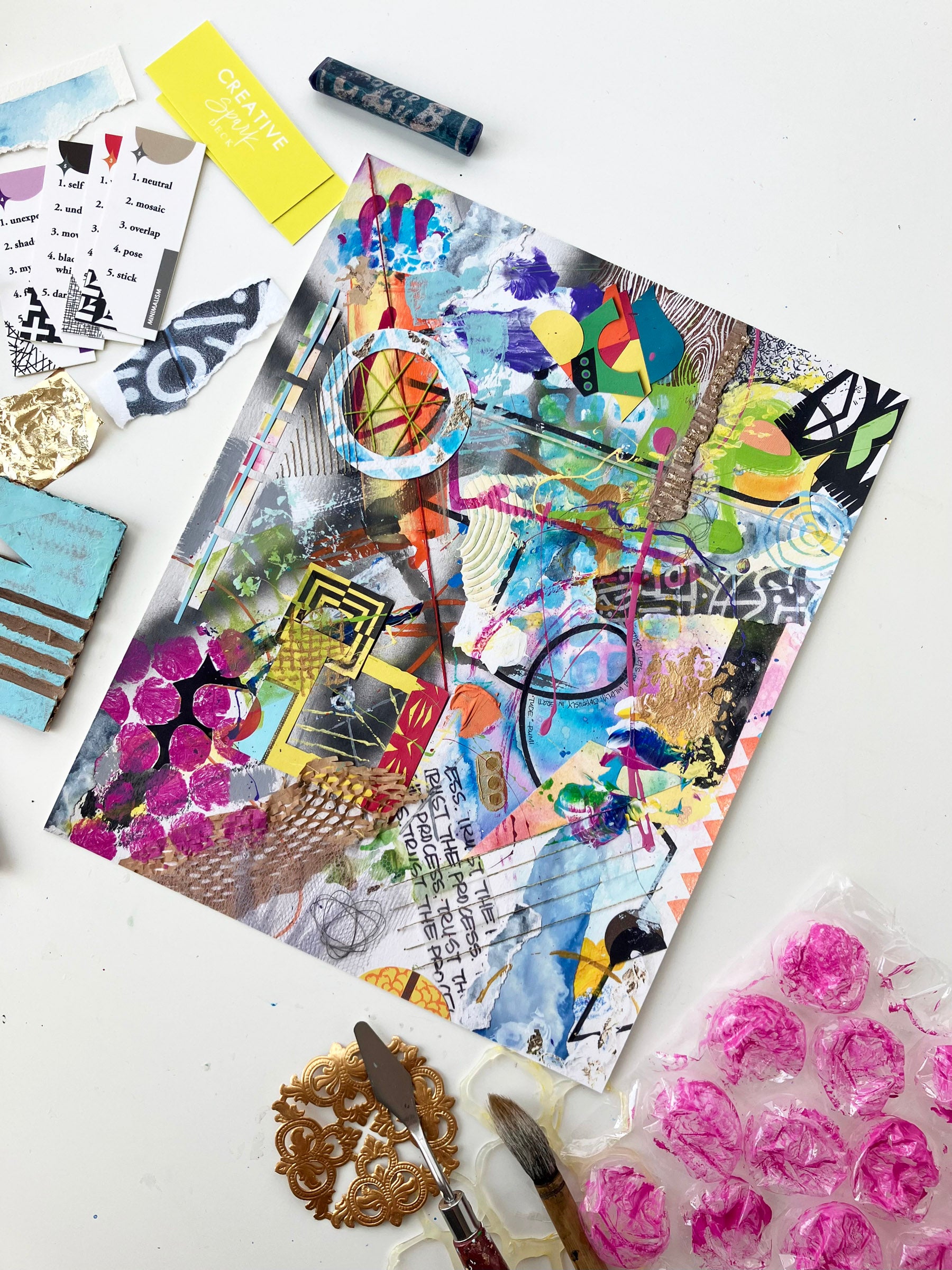 This is my 6th 100 Day Project and it feels like all my past projects have led me here! I decided to bring in all the elements I've used before to explore creating a mixed media piece over 100 days. Every day I added one new element to it, inspired by a prompt from my Creative Spark Deck. I also created minis alongside my main project which added a new twist and challenge!